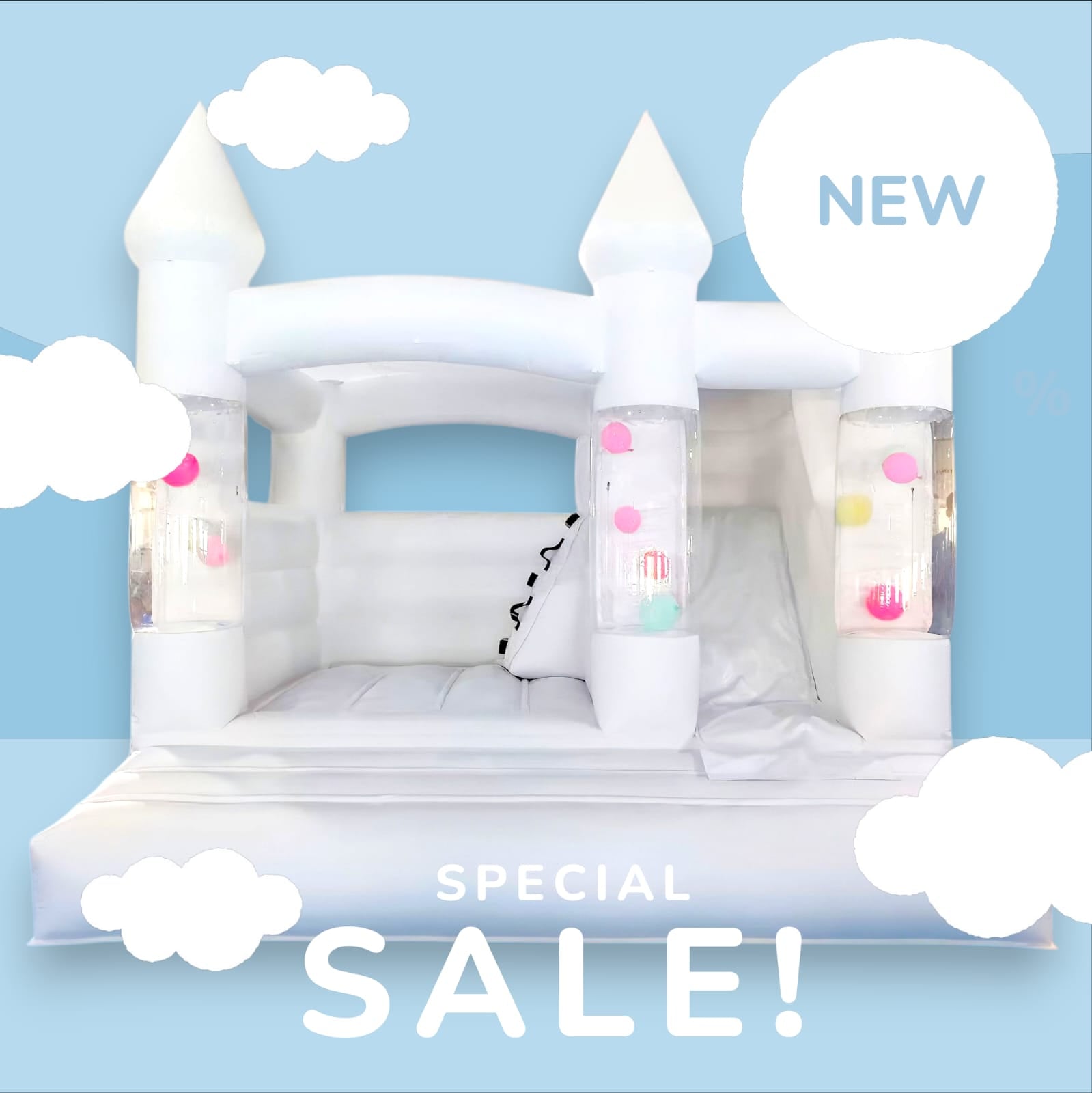 Bring magic to your event with our White Castle Bounce House! This elegant inflatable features white towers, a fun slide, and balloon pillars. It's ideal for birthdays, weddings, or any celebration. Made from durable PVC, it's TSSA certified for safety.
